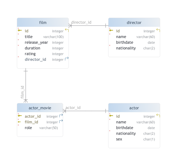 We will assume for a moment, for didactic reasons, that each film has only one director (which, of course, is sometimes not the case). You need a director's name, nationality and date of birth. You also want to give your film a rating (integer from 0 to 5).