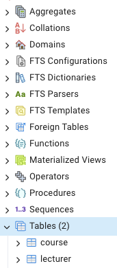 In the chapter ‘One-to-many relationships’ you built a small model (consisting of two tables ‘Course’ and ‘Lecturer’) in the schema named your r-number, in the database of your group. Now check through pgAdmin whether that schema is still there? If not: create it via the steps in that section (ten minutes of work).