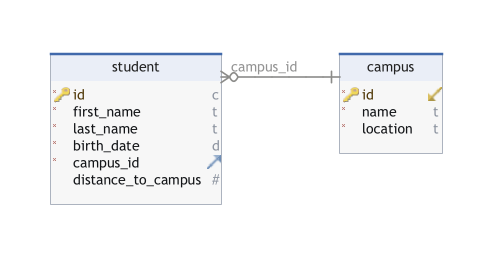 Specifically, it involves a listing of all eight campuses of UCLL and a table of 1,000 students with some personal information for each student, which campus they go to (a student can only belong to one campus) and how far they live from this campus. The latter field is not mandatory. By the way, we created this schema as an example for automatic data generation in DBSchema or using a site such as https://mockaroo.com.